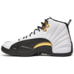 The Air Jordan 12 Retro ‘Royalty’ adds gilded accents to a two-tone design reminiscent of the OG ‘Taxi’ colorway from 1996. The mid-top makes use of a white tumbled leather upper with radiating stitch detailing and black lizard-textured overlays. Contrasting pops of metallic gold land on the molded top eyelets . midfoot TPU piece and the Jumpman and ‘Two 3’ branding embroidered atop the tongue. Responsive cushioning comes courtesy of a full-length Zoom Air unit. Underfoot . the outsole features rubber herringbone traction pods and a carbon fiber spring plate.
