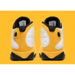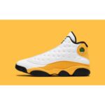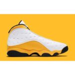 This Air Jordan 13 is expected to feature White leather on the panels . toe . and tongues with a matching liner. Other details include Yellow (Del Sol) suede overlays . Red appearing on the Jumpman tongue and outsole completed with a Black rubber sole.