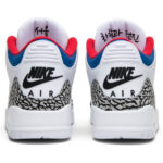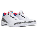 This iteration of the Air Jordan 3 commemorates the 1988 Olympics in Seoul. Taking inspiration from the South Korean flag . the shoe features black . red . and blue accents on the inner lining and collar. The white upper . constructed from tumbled leather . includes the Jordan 3’s signature elephant print panels. Korean characters appear on the inside of each tongue: ” (Seoul) on one side; the 1988 games motto . ‘ ‘ (Harmony and Progress) on the other.