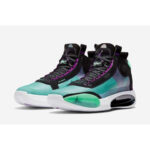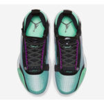Sporting a mixture of Blue Void . Green Glow . Black . and Metallic Silver . the AJ 34 is defined by its transparent Eclipse plate that is light . while providing dynamic control. The sneakers grid patterned translucent upper reveals green hues underneath . while black and purple accents scattered throughout provide a solid touch of contrast. Finally . a custom white Zoom Air sole and traction pattern tops off the design . which is one of the lightest Air Jordans to date.