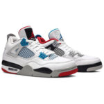 Released in November 2019 . the Air Jordan 4 Retro SE ‘What The 4’ takes the original four colorways of the Air Jordan 4 and combines them in a ‘What The’ format that has been seen on several Nike silhouettes. This original color palette is realized on the entire shoe . with the beloved Varsity Red . Cement Grey and Military Blue that Jordan 4 fans recognize and love. The discordant aesthetic works across the leather uppers . signature lacing wings and Jumpman logos on the tongue and heel to create something familiar yet new.