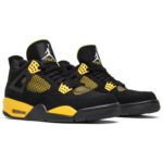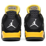 The 2012 edition of the Air Jordan 4 Retro ‘Thunder’ brings back one-half of the coveted ‘Thunder and Lighting’ pack from 2006. Smooth black nubuck is utilized on the upper . with contrasting yellow accents on the eyelets . quarter panel and interior tongue. The latter features a woven Jumpman-branded tag on the exterior side . complementing a second Jumpman logo on the molded heel panel. Lightweight cushioning arrives via a yellow polyurethane midsole with a visible Air sole unit nestled in the heel.