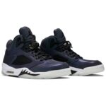 Air Jordan 5 Retro ‘Oil Grey’ celebrates the silhouette’s 30th anniversary with a dark blue leather upper entirely treated with a 3M reflective finish. Complementary black hits appear on the eyelets . quarter panels and embroidered Jumpman branding at the tongue and heel. The dark tones up top are offset by a contrasting white midsole . supported underfoot by a semi-translucent rubber outsole.