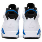 Released in 1991 as one of five original colorways . the Air Jordan 6 ‘Sport Blue’ (aka ‘September Blue’) didn’t see its first retro release until 2014. The shoe made its long-awaited return as part of the ‘Sport Blue Pack’ that also featured the Air Jordan 3 and Air Jordan 14. The sneaker features an all-white upper in smooth and perforated leather with the Air Jumpman logo on the shoe’s signature rubber tongue and lace overlay . as well as on the heel section.