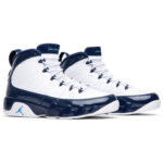 The Air Jordan 9 Retro ‘UNC’ features a familiar colorway that pays tribute to Michael’s University of North Carolina alma mater. Specifically . the design replicates an Air Jordan 9 Low from 2002 . with the shoe sporting a white leather upper that’s complemented by Midnight Navy overlays in patent leather. Pops of University Blue are utilized on the Jumpman logos that adorn the midsole and sockliner.
